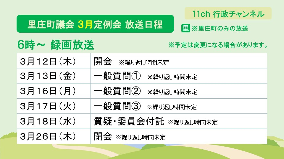 11チャンネル行政 里庄 里庄町議会定例会 里庄町議会定例会をお送りします。(※収録放送) 放送日 3月12日(木)、13日(金)、16日(月)~18日(水)、26日(木)※議会の放送日程は予定です(変更する場合有) 放送時間 初回6:00から繰り返し放送 番組の見どころ コミュニティチャンネル一覧へ